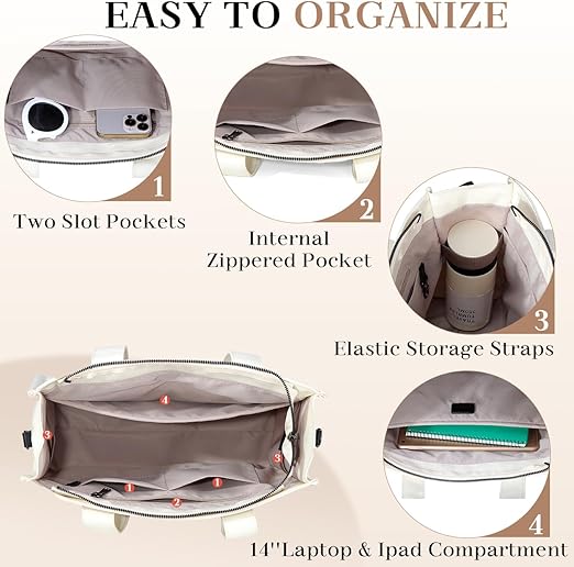 - 【Spacious & Practical】Size:14.17x4.73x10.63 inches. This canvas tote bag with zipper has a large capacity main compartment and 1 inner zipper pocket. Two elastic storage straps can fix the water bottle inside. There are two small pockets in the front and back, and the back pocket has magnetic buttons. It can store 14in iPad, cell phone, purse, cosmetics, etc. And provides ample space for all your belongings.